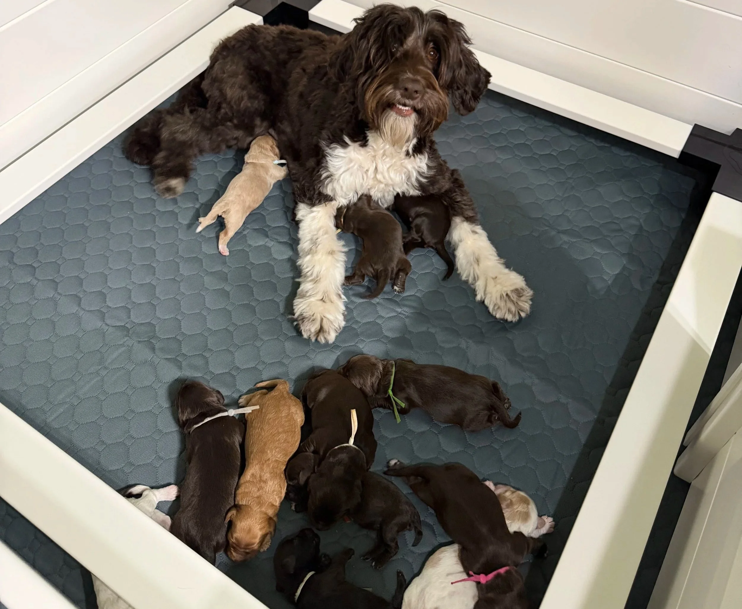 Halo and Ziggy welcomed their second litter together on February 3rd. We are so thrilled to welcome Halo’s “Baker’s Dozen” litter as she was carrying a whopping THIRTEEN puppies! These pups are chocolates and caramels in solid, some white, and some heavy parti markings. They will be 25-35 pounds and so eager to please and people focused. We are accepting reservations for a go home date of March 31st.